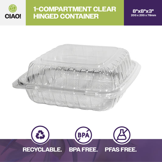 CIAO! 8"x8"x3" 1 Compartment PP Plastic Clear Hinged Container for Take Out (Case of 200)