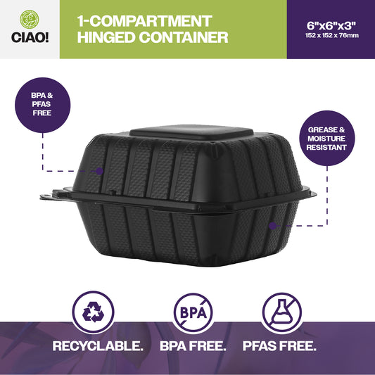 CIAO! 6"x6"x3" MFPP Black Hinged Container With Lid 1 Compartment (Case of 300)