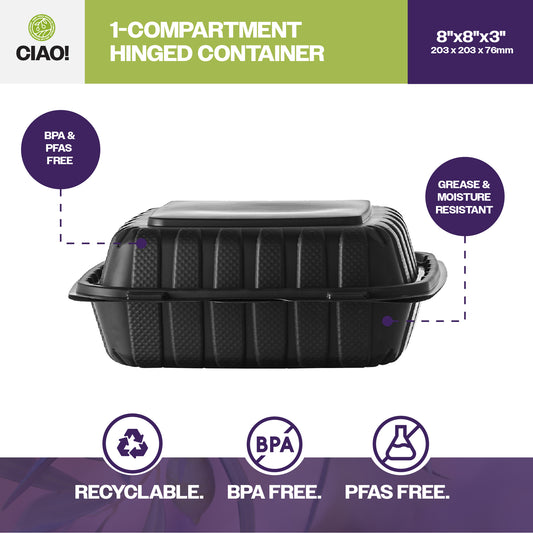 CIAO! 8"x8"X3" MFPP Black Hinged Container With Lid 1 Compartment (Case of 200)