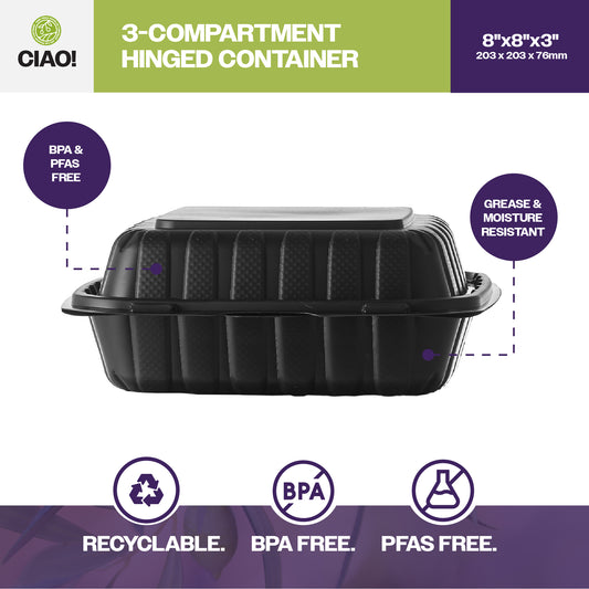 CIAO! 8"x8"x3" MFPP Black Hinged Container With Lid 3 Compartment (Case of 200)