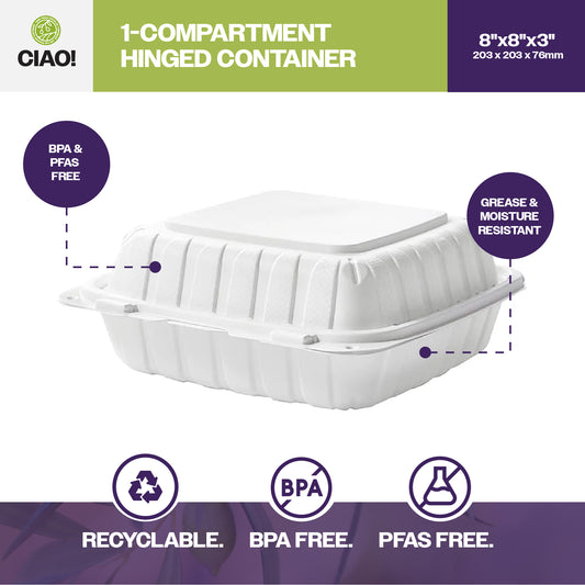 CIAO! 8"x8"X3" MFPP White Hinged Container With Lid 1 Compartment (Case of 200)