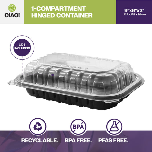 CIAO! 9"x6"x3" MFPP Black Hinged Container With Lid 1 Compartment (Case of 200)