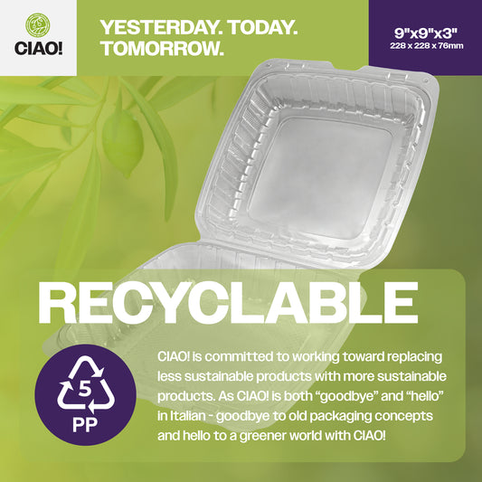CIAO! 9"x9"x3" Polypropylene Black bottom with Clear Lid Hinged Container 1 Compartment Take Out Container, Microwavable, Recyclable and Reusable, (Case of 150)