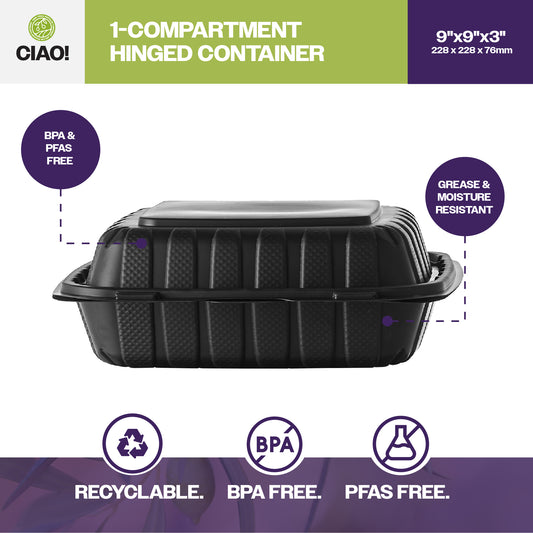 CIAO! 9"x9"x3" MFPP Black Hinged Container With Lid 1 Compartment (Case of 150)