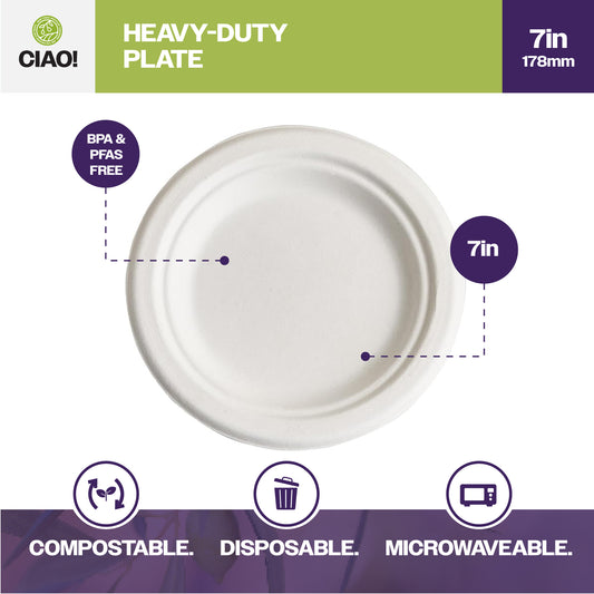 CIAO! 7" Heavy Duty Plate 100% Compostable Ecofriendly PFAS Free Unbleached Bagasse Natural White (Pack of 1,000)