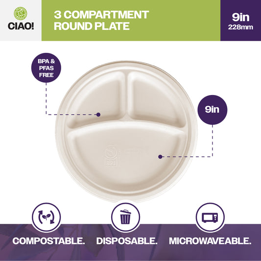 CIAO! 9" Heavy Duty Plate 3 compartment 100% Compostable PFAS Free Unbleached Bagasse Natural White (Pack of 500)