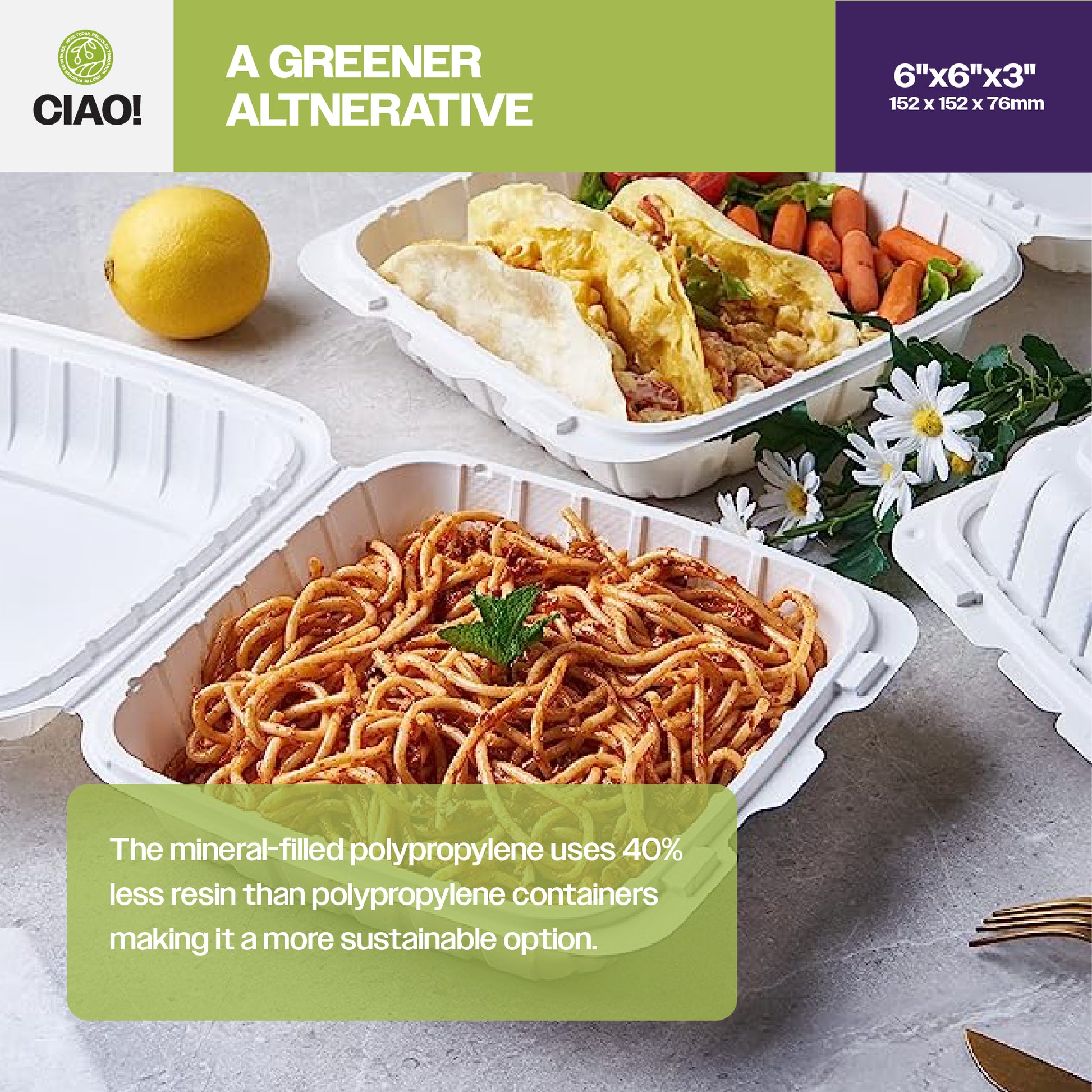 CIAO! 6"x6"x3" MFPP White Hinged Container – Compact, Durable, and Sustainable