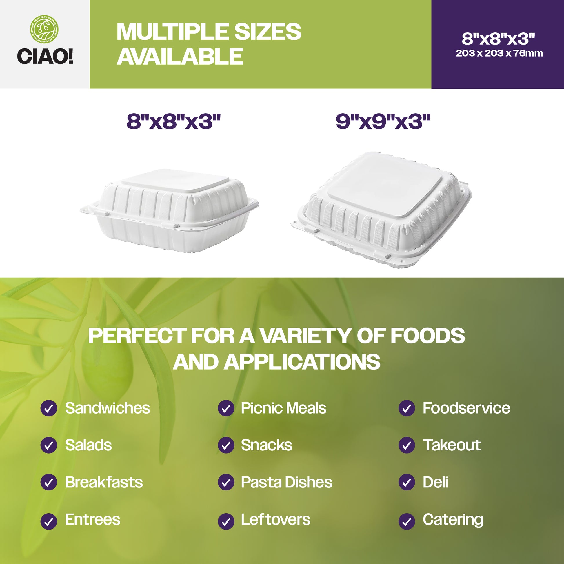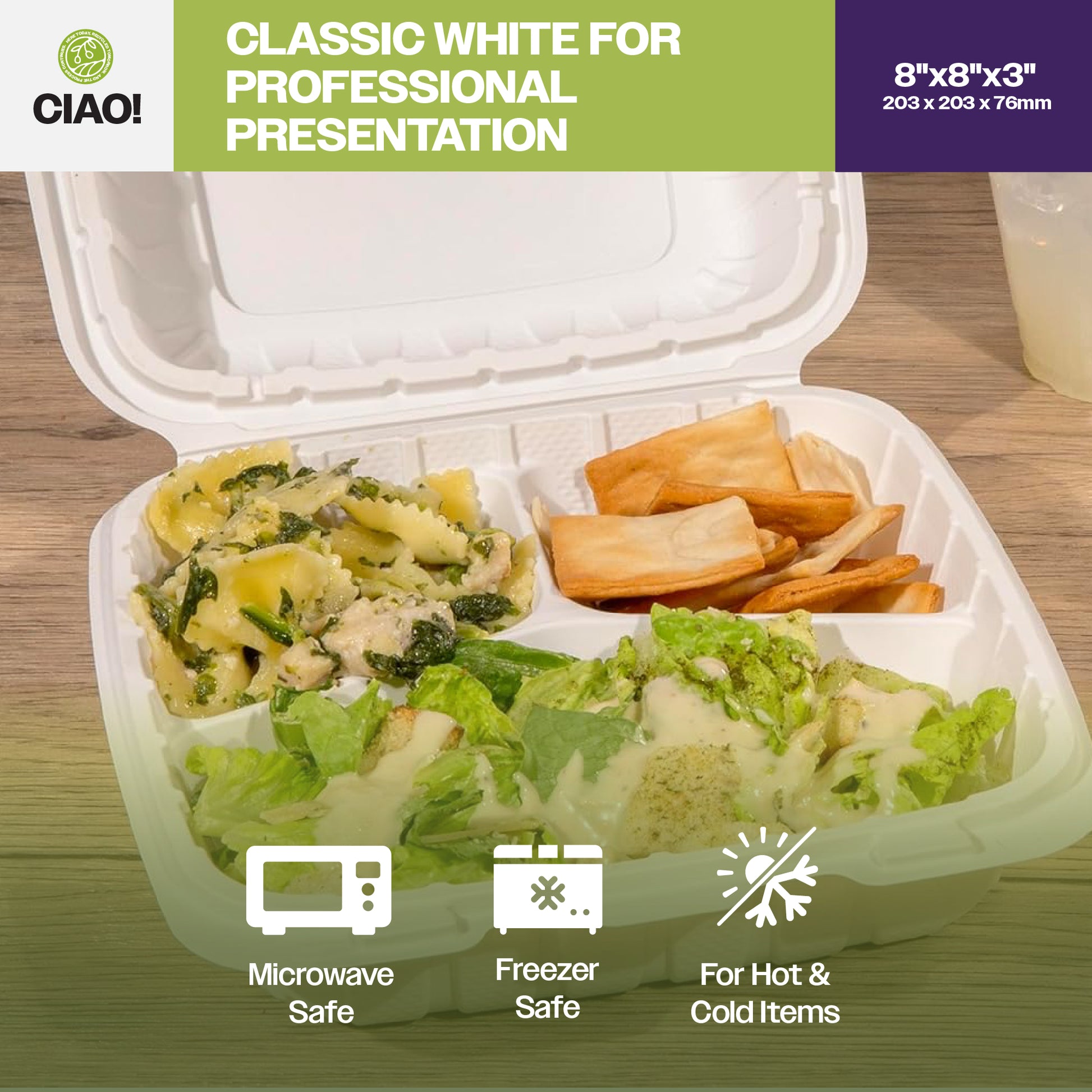 The CIAO! 8"x8"x3" White Hinged Container with 3 Compartments offers the perfect blend of functionality and eco-conscious innovation. Its compact size and organized design make it a dependable choice for food service while supporting sustainability goals.