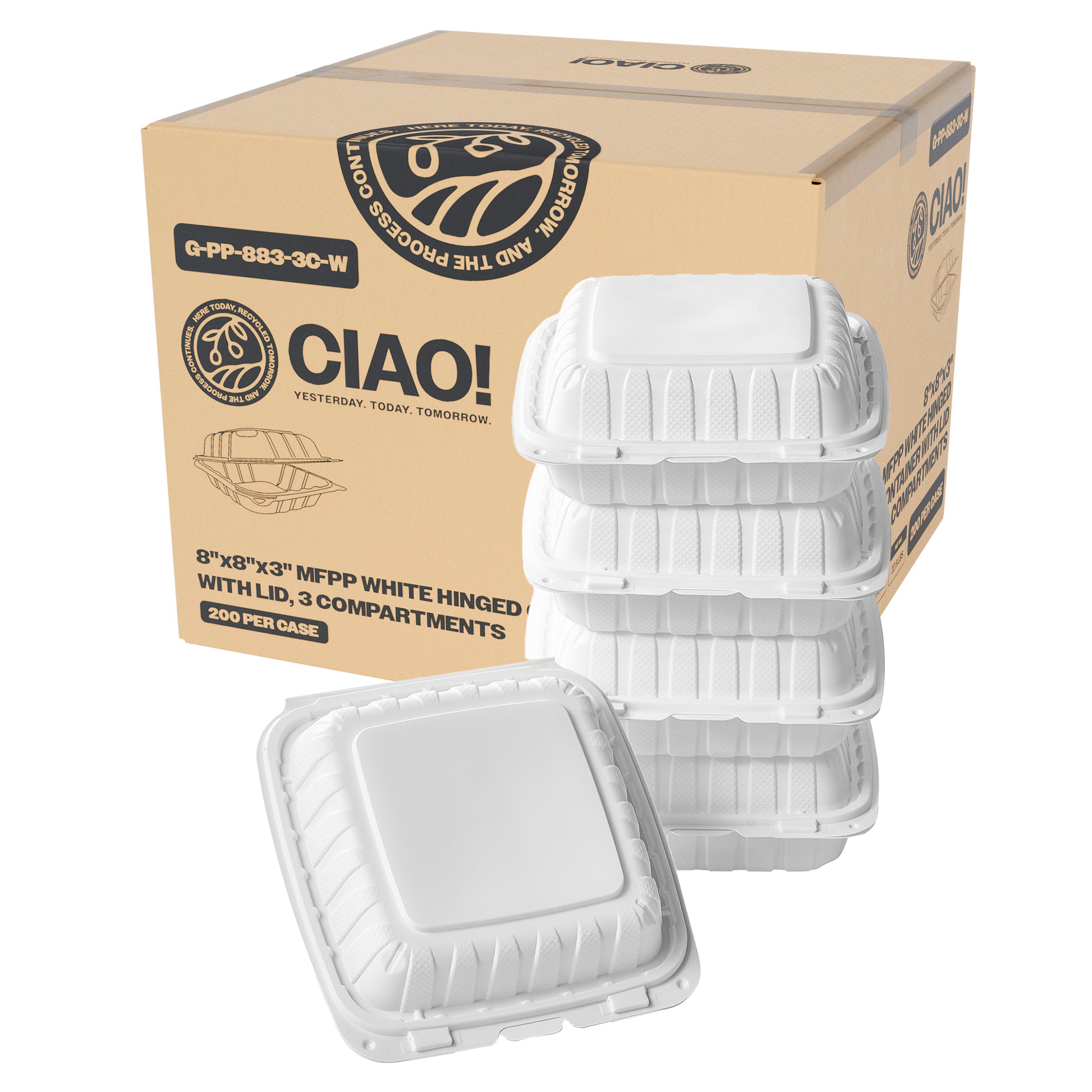 CIAO! 8"x8"x3" MFPP White Hinged Container – 3 Compartments for Organized Meals
