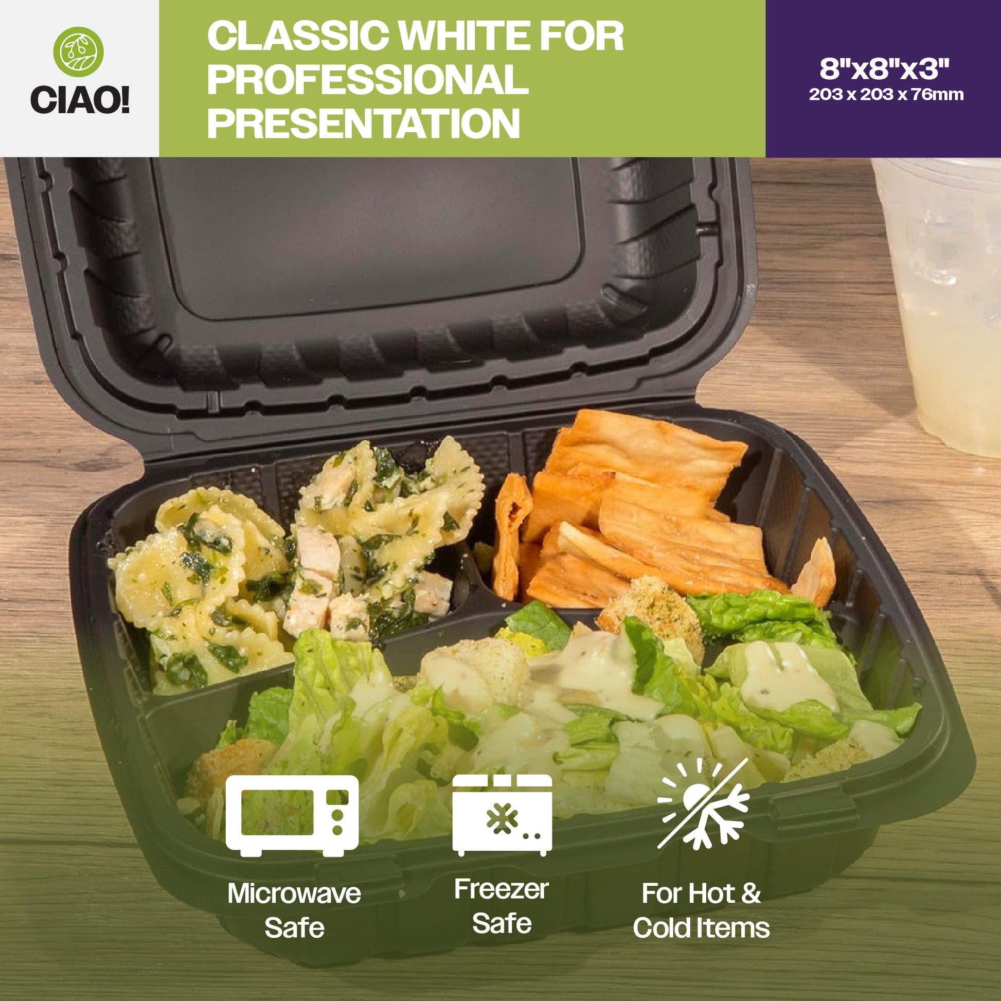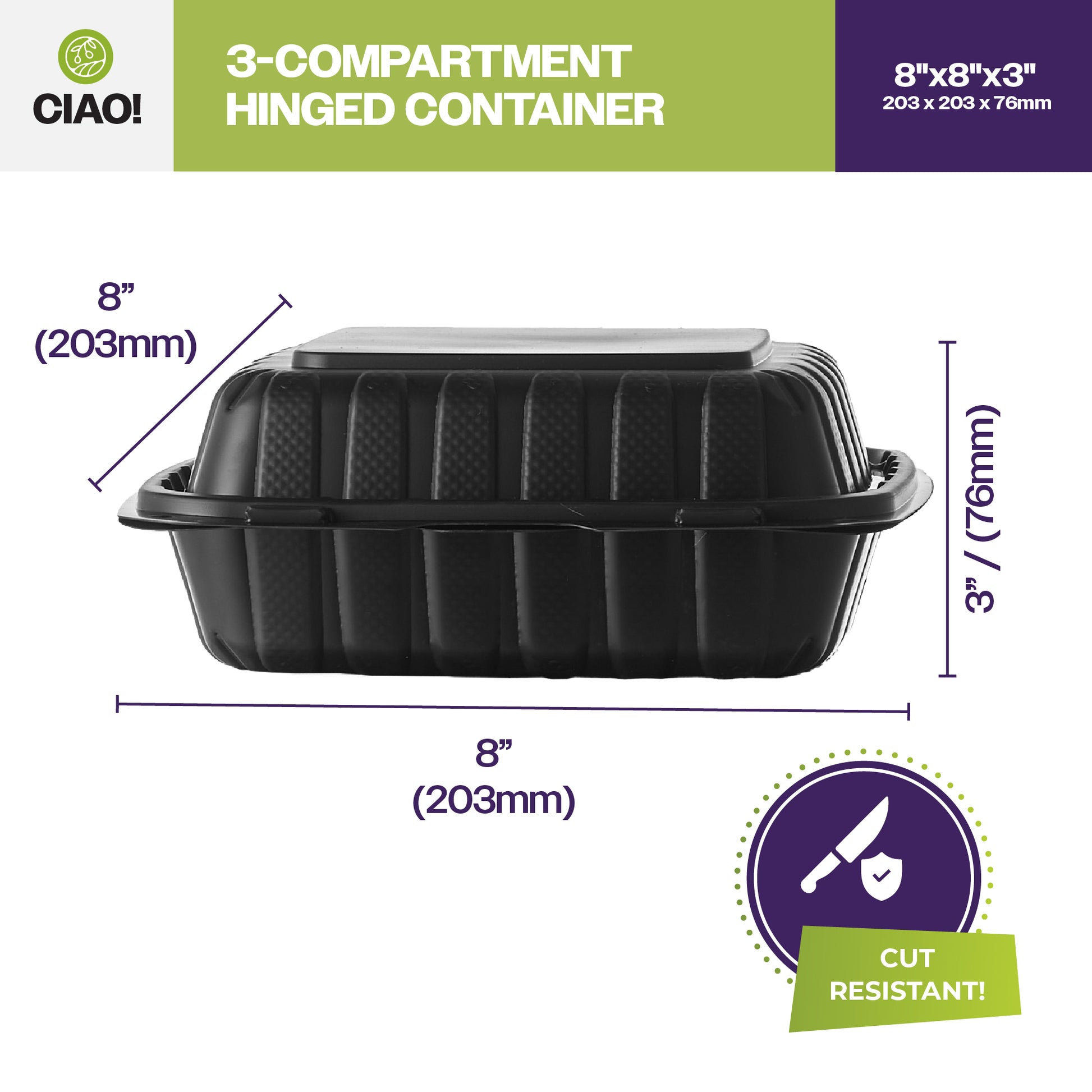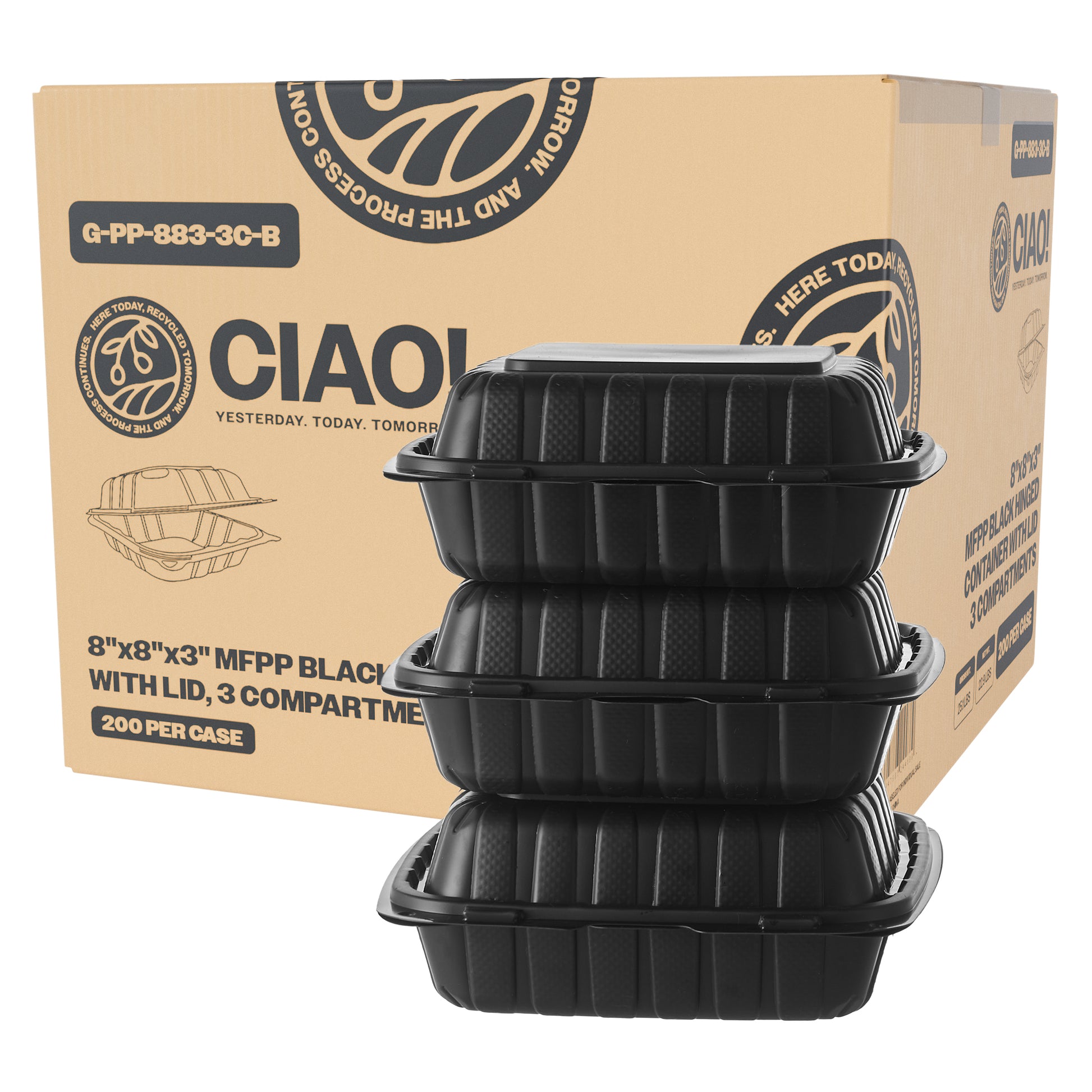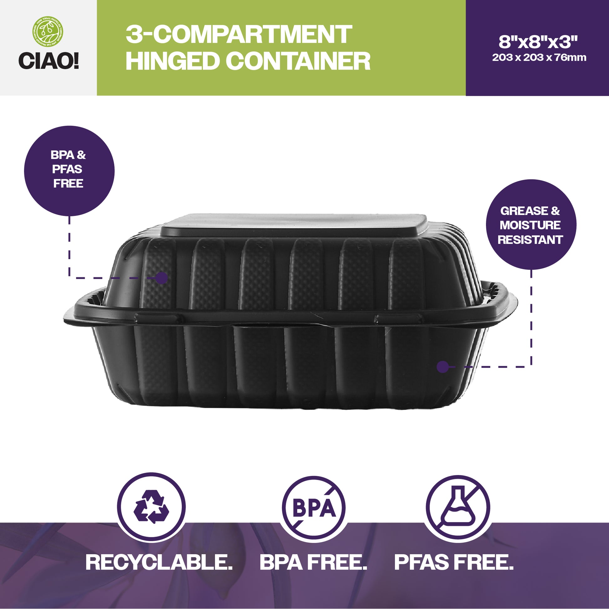CIAO! 8"x8"x3" MFPP Black Hinged Container – 3 Compartments for Perfect Food Separation