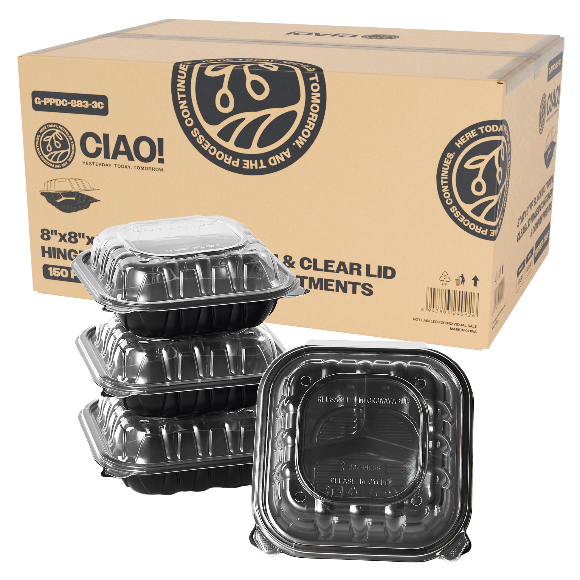 CIAO! 8"x8"x3" Polypropylene Black bottom with Clear Lid Hinged Container 3 Compartment Take Out Container, Microwavable, Recyclable and Reusable, (Case of 150)