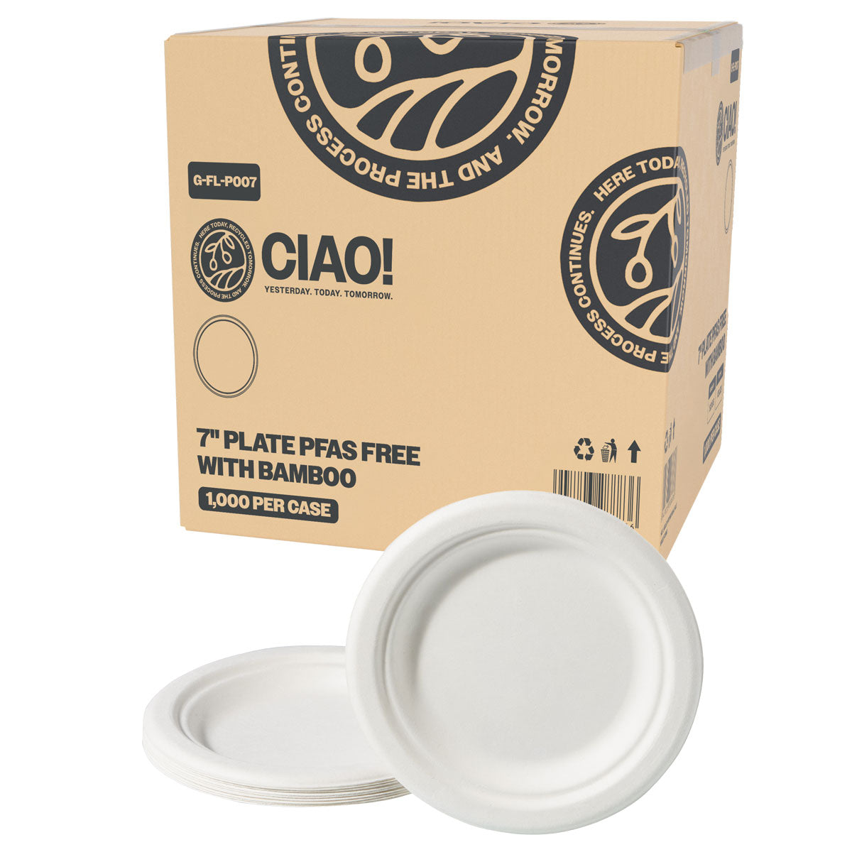 CIAO! 7" Heavy Duty Plate 100% Compostable Ecofriendly PFAS Free Unbleached Bagasse Natural White (Pack of 1,000)