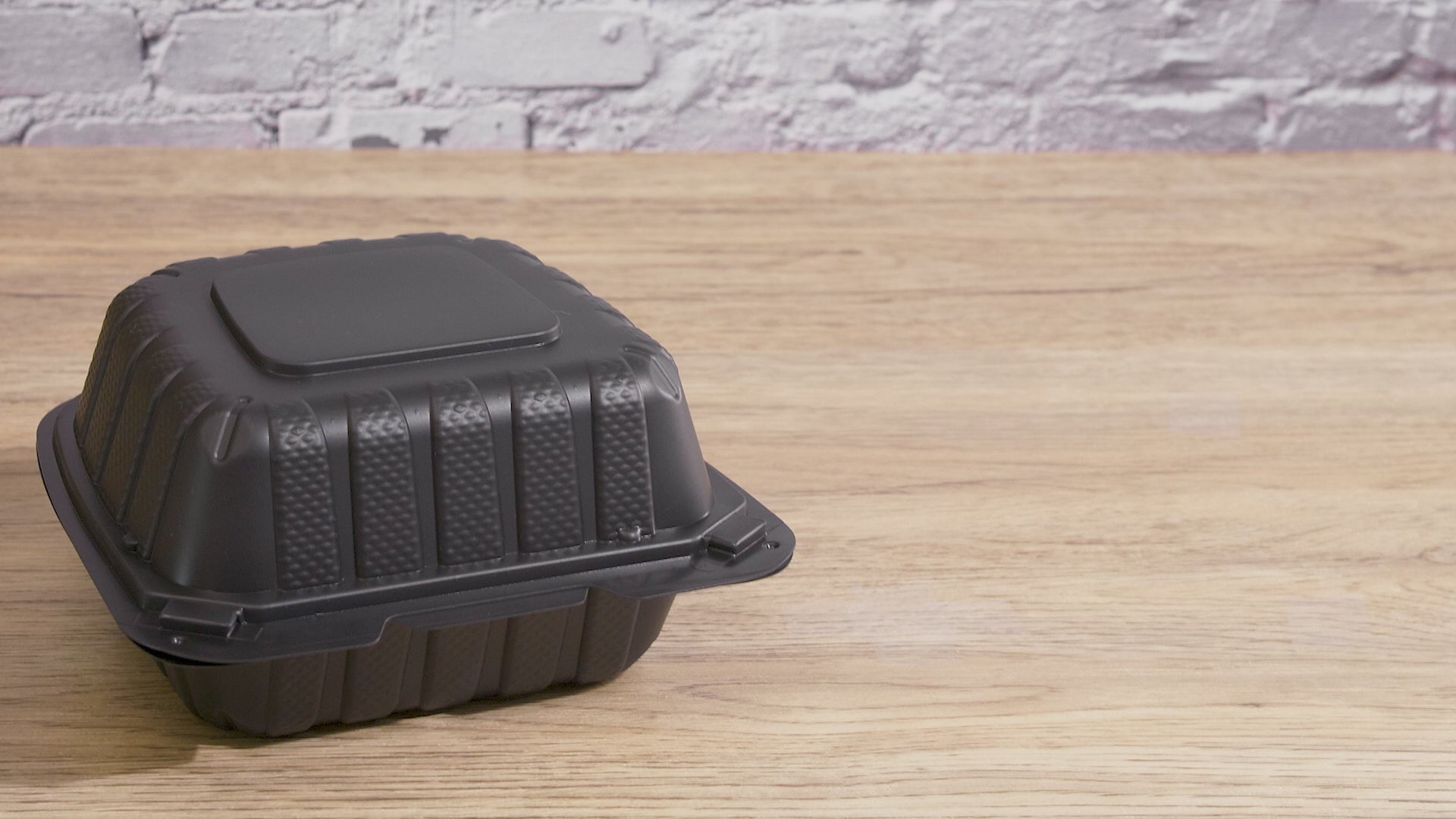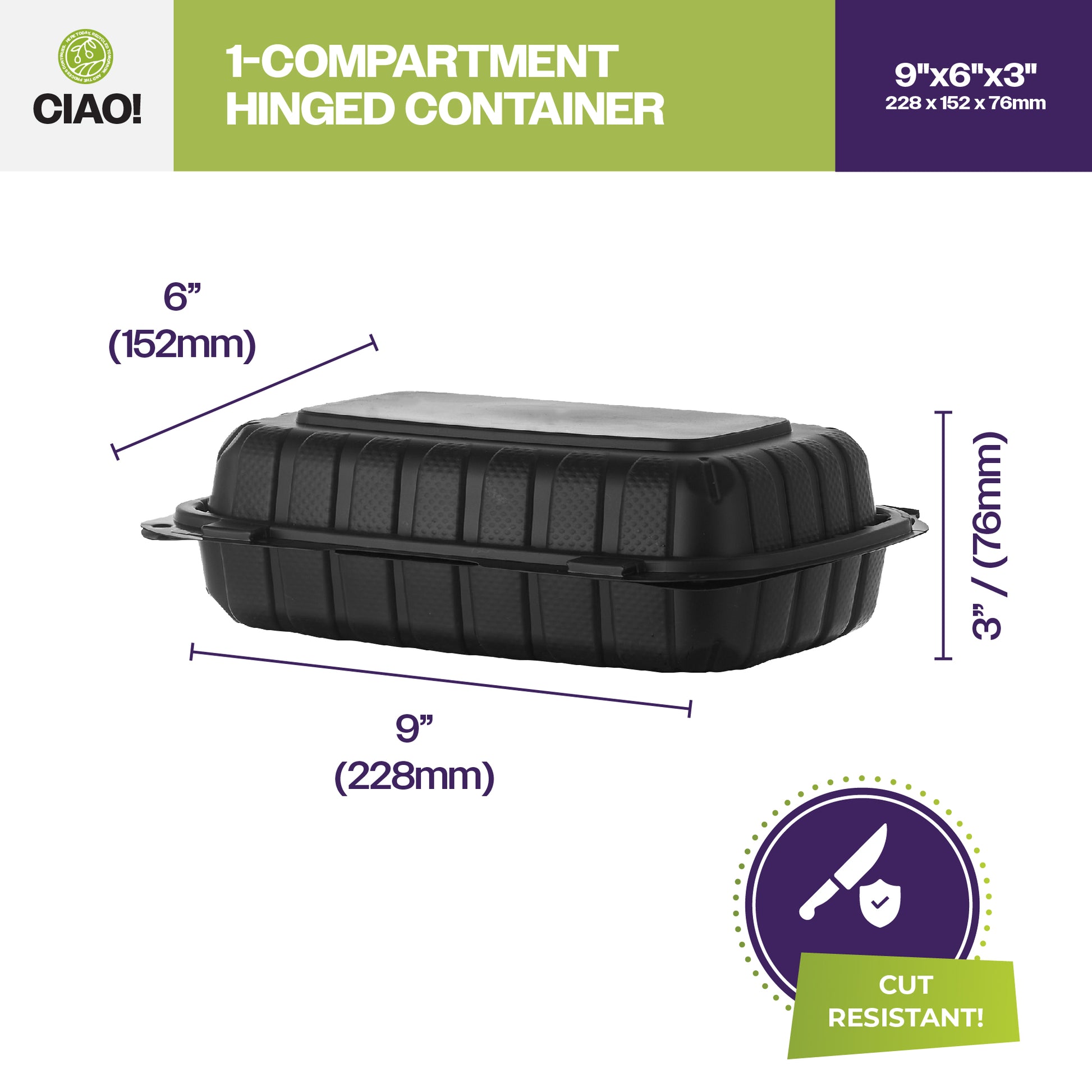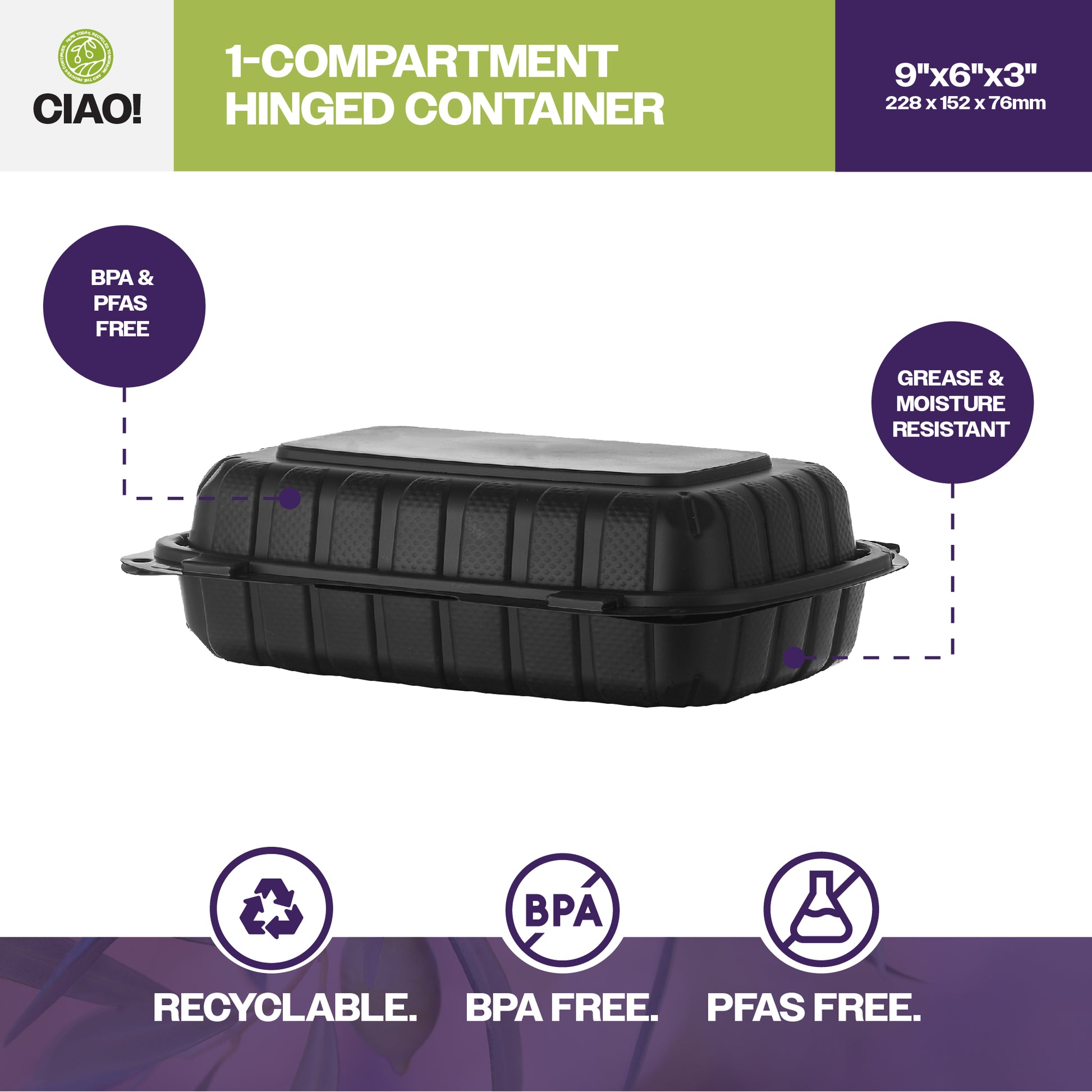 The CIAO! 9"x6"x3" Black Hinged Container with 1 Compartment combines functional design with eco-conscious innovation. Its compact size makes it easy to store and transport, while the secure lid and leak-proof design make it a reliable choice for any food service need.