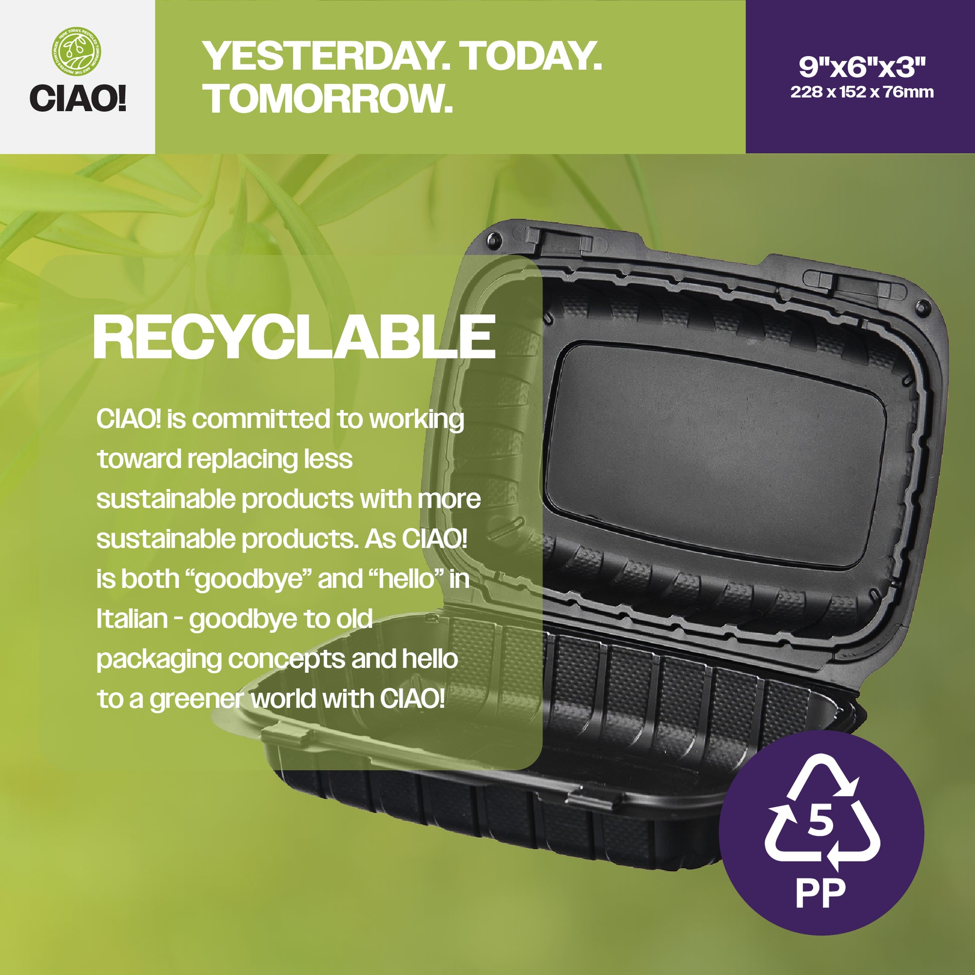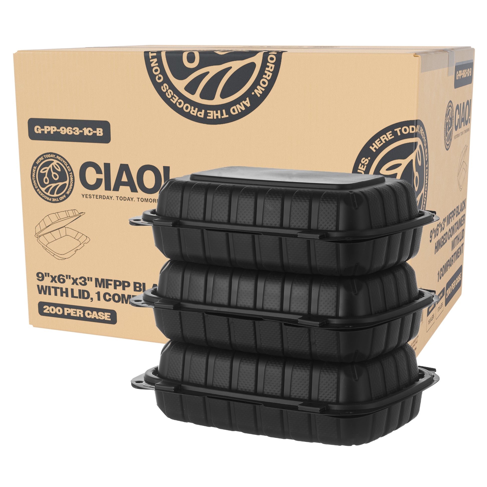 CIAO! 9"x6"x3" MFPP Black Hinged Container with Lid – 1 Compartment for Convenient Food Storage