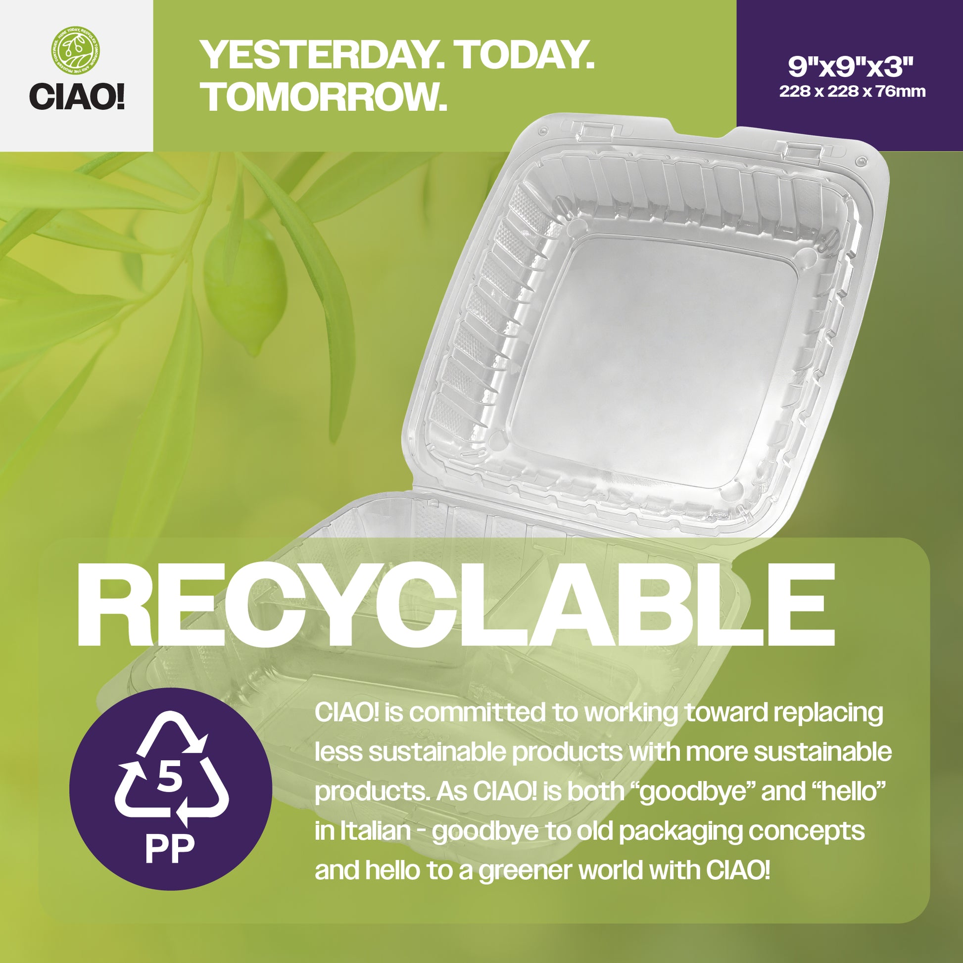Simplify your takeout and meal storage needs with the CIAO! 9"x9"x3" 3 Compartment PP Plastic Clear Hinged Containers. These containers are thoughtfully designed with three separate compartments, making them perfect for keeping entrees, sides, and sauces neatly divided while maintaining freshness and flavor.