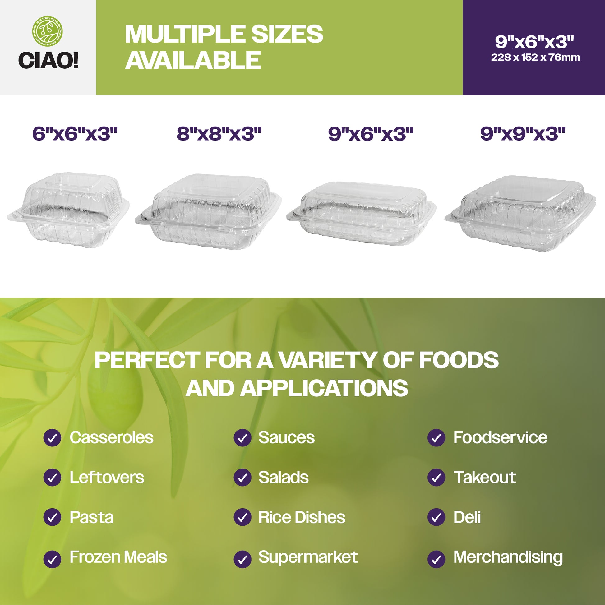 Whether you're packing entrees, sides, or desserts, the CIAO! 1 Compartment Hinged Containers offer a reliable and professional solution for all your food packaging needs.