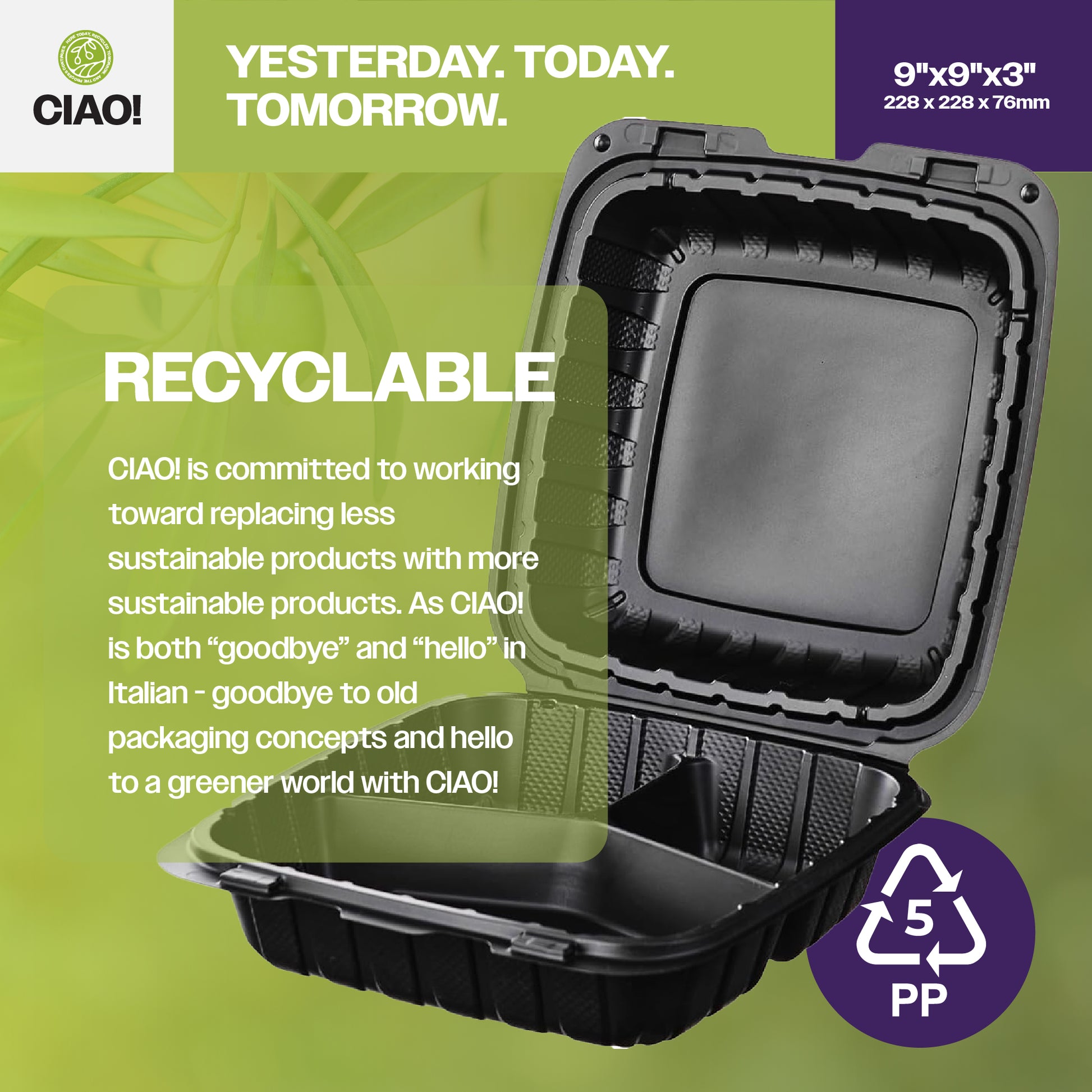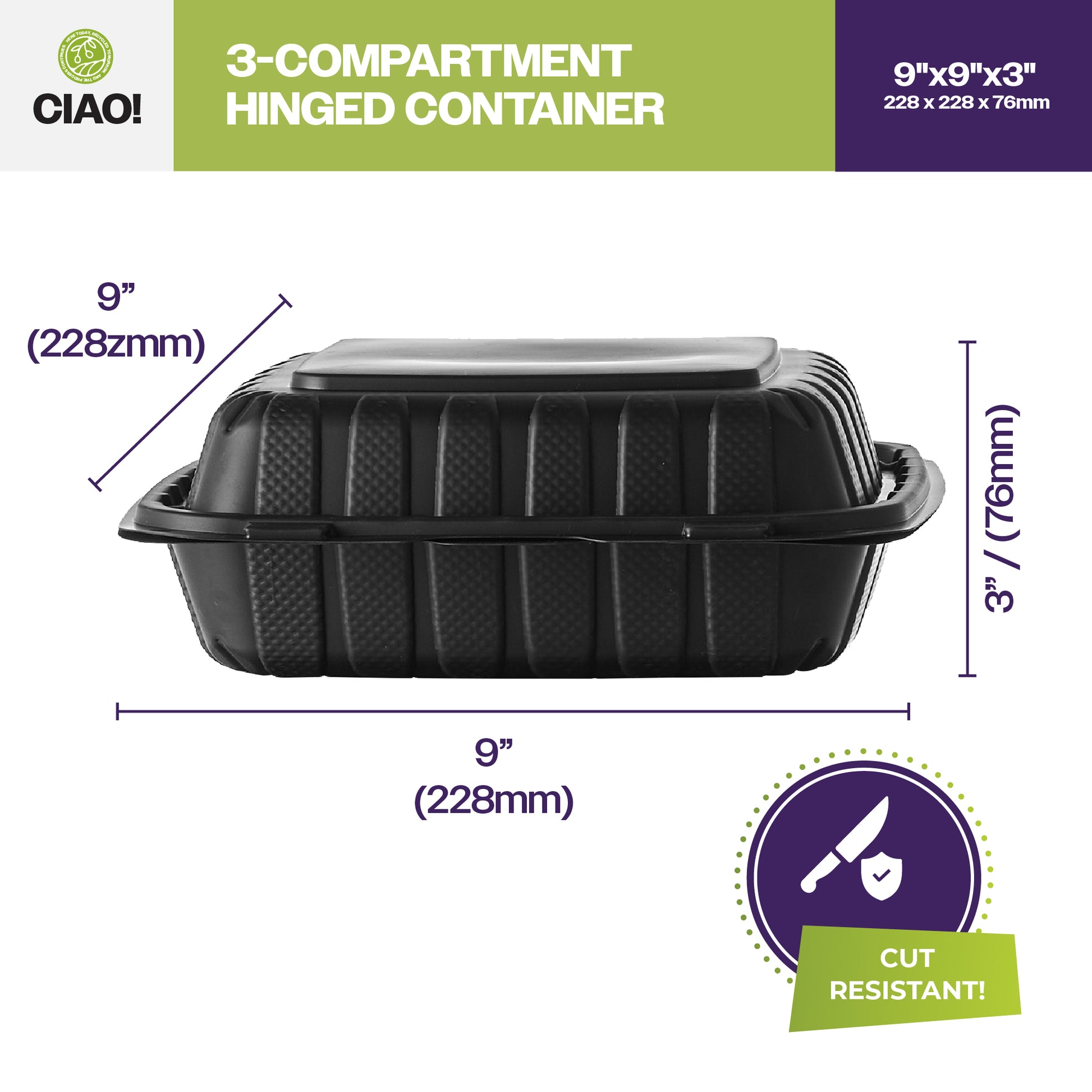 CIAO! 9"x9"x3" MFPP Black Hinged Container with Lid – 3 Compartments for Convenient Meal Separation
