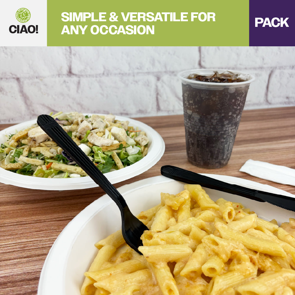 Made from heavy-weight polypropylene, the utensils are sturdy enough to handle hearty dishes without bending or snapping. The sleek black finish elevates the look of disposable service, pairing well with both casual and upscale dining environments. With BPA-free and PFAS-free materials, these utensils are safe, reliable, and recyclable — a smarter choice for today’s food service needs.