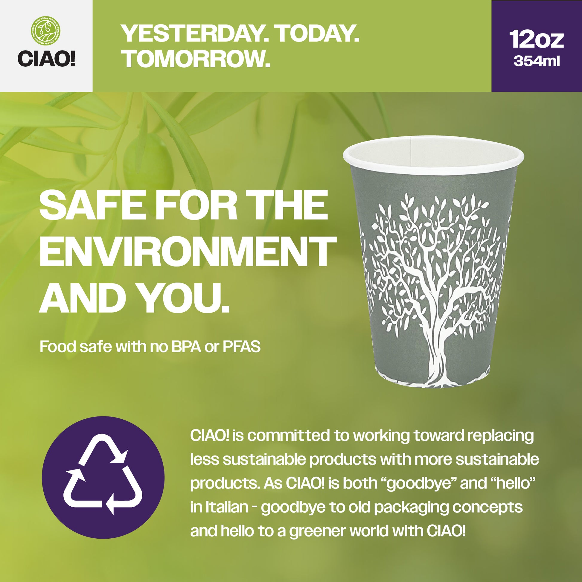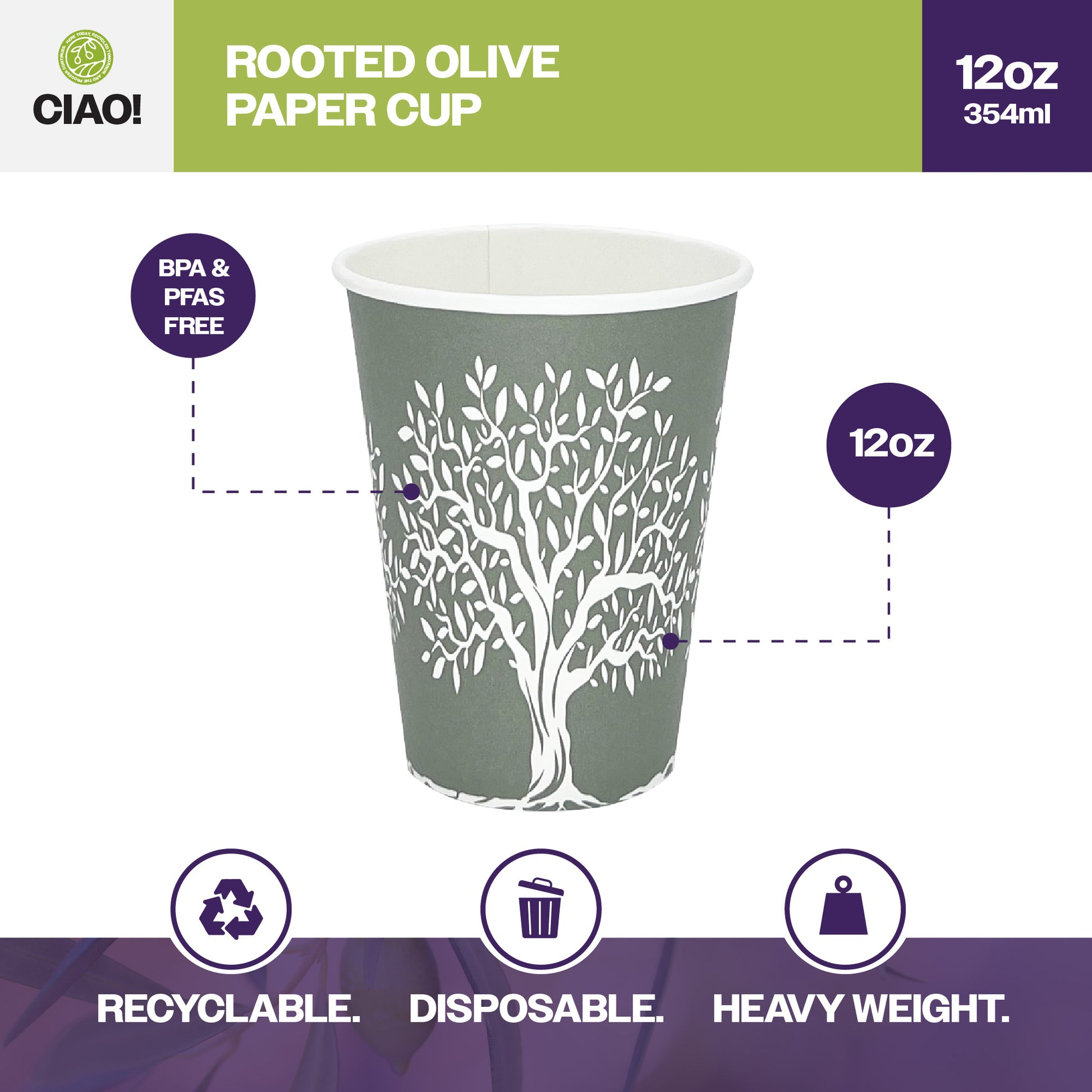 CIAO! 12 oz Hot Paper Cups – Rooted Olive Print (Case of 1,000)