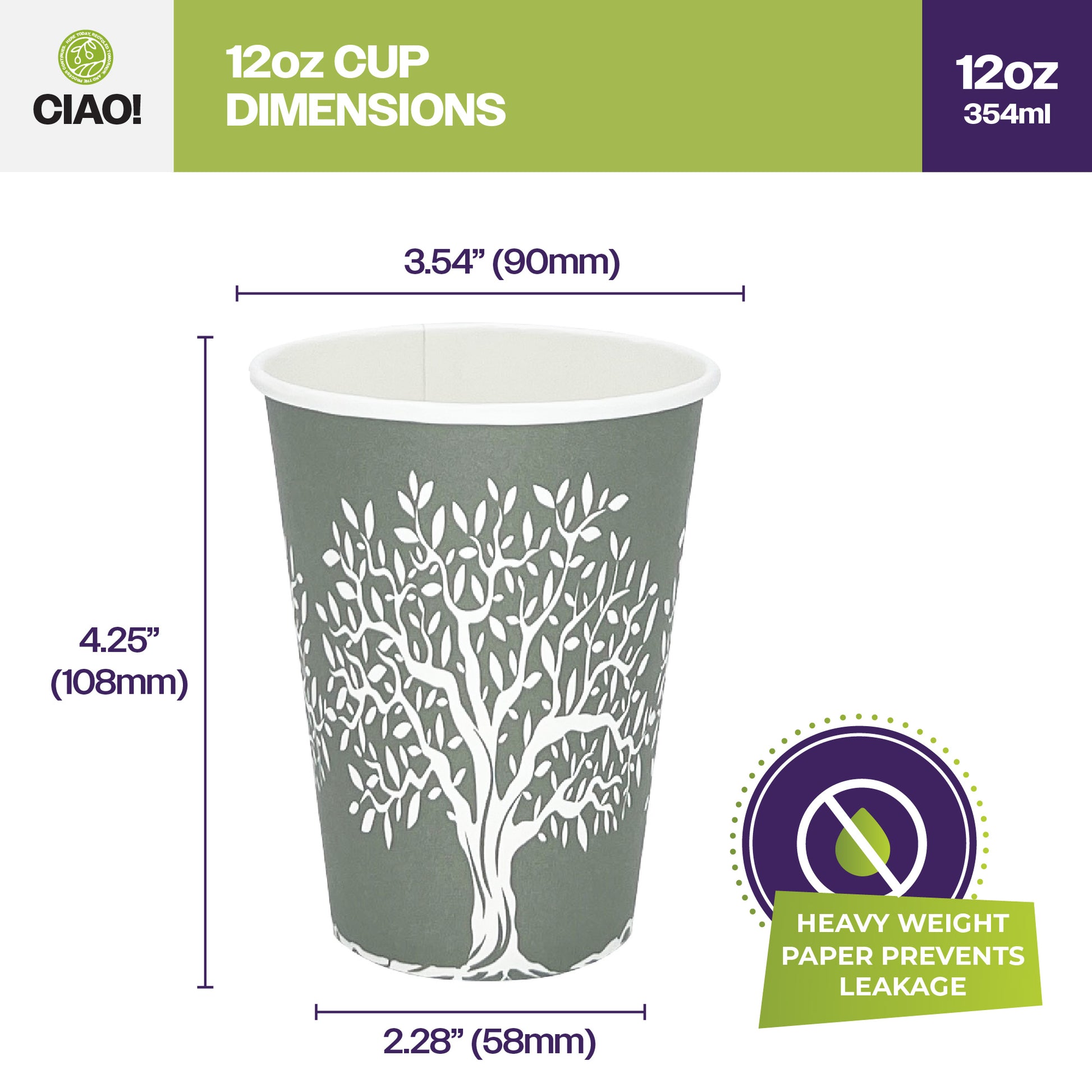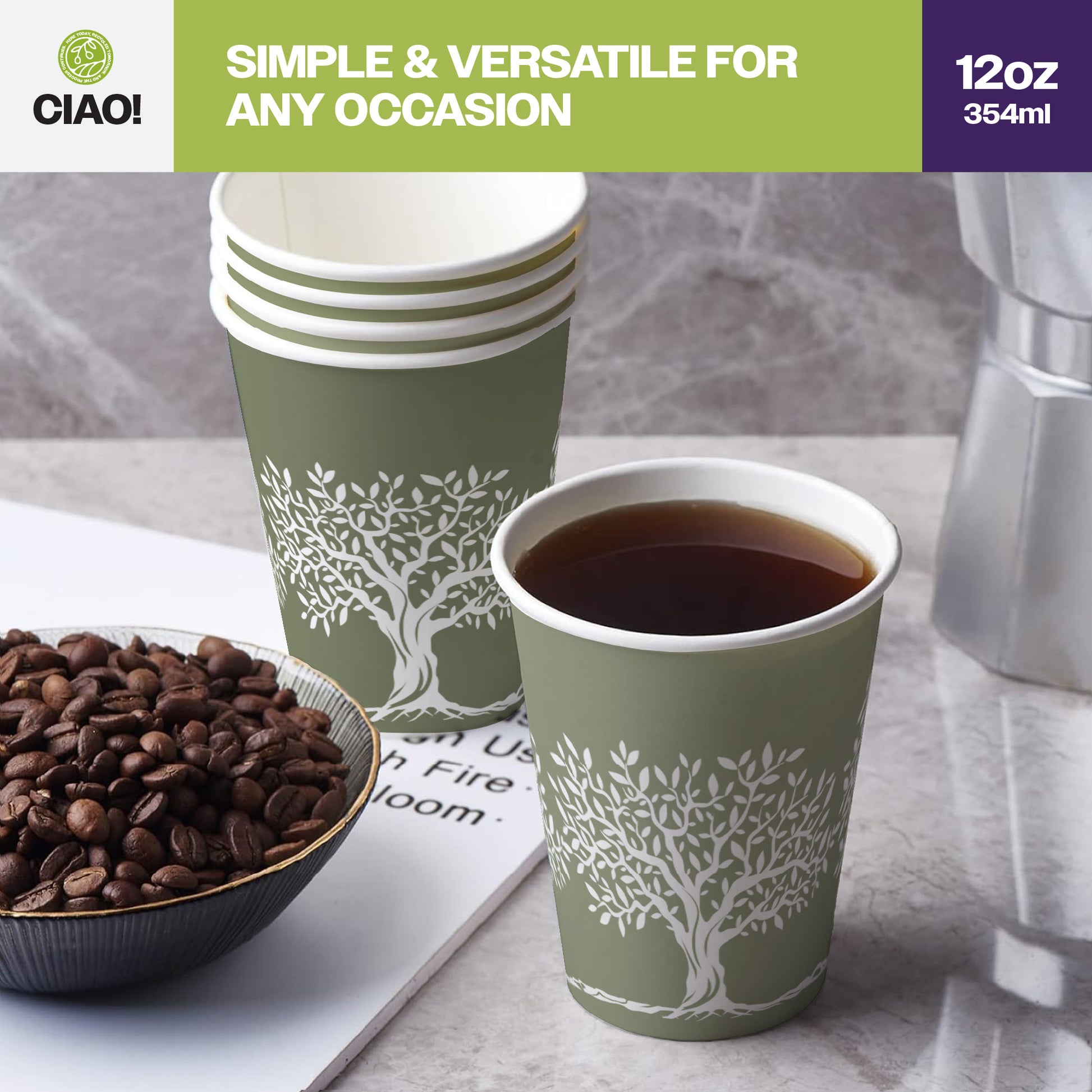 Serve your hot beverages with confidence and style using the CIAO! 12 oz paper hot cups in our signature Rooted Olive print. With a perfect balance of function and design, these disposable cups are a great choice for coffee shops, events, offices, and home use. Made from durable, food-grade paper and lined to resist leaks, they’re ready to meet the demands of any busy environment.