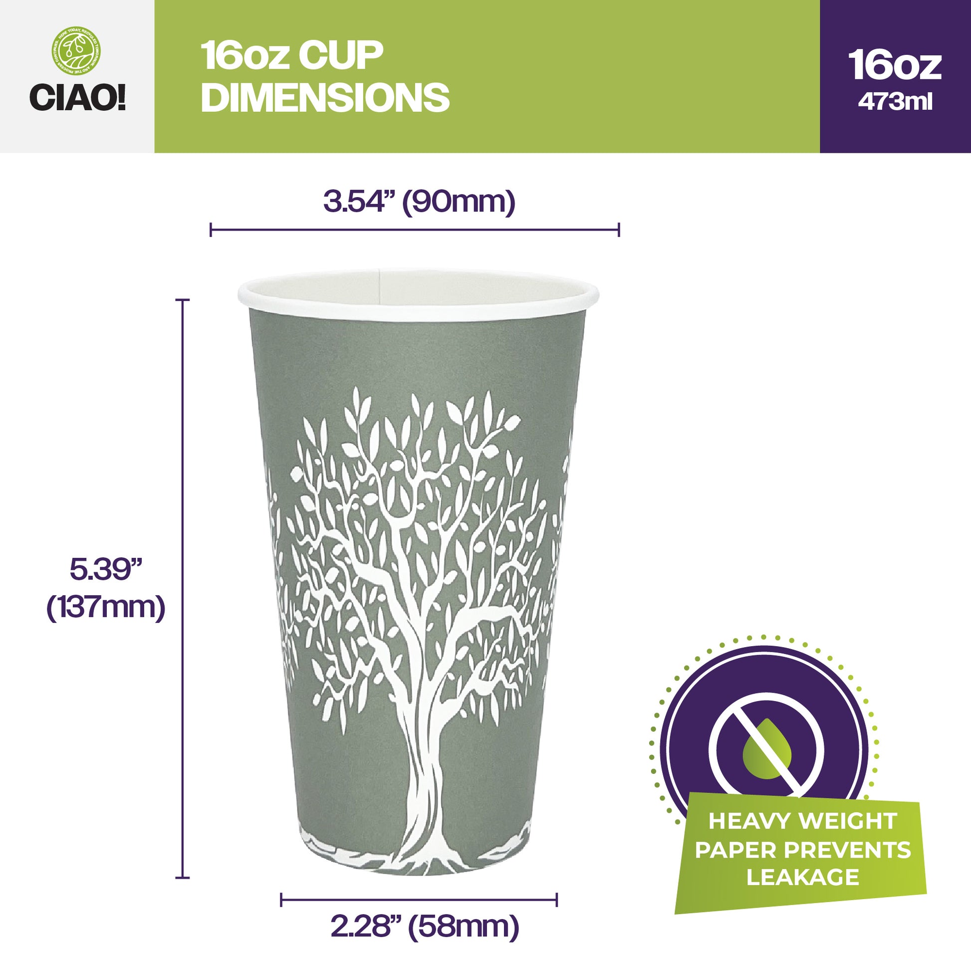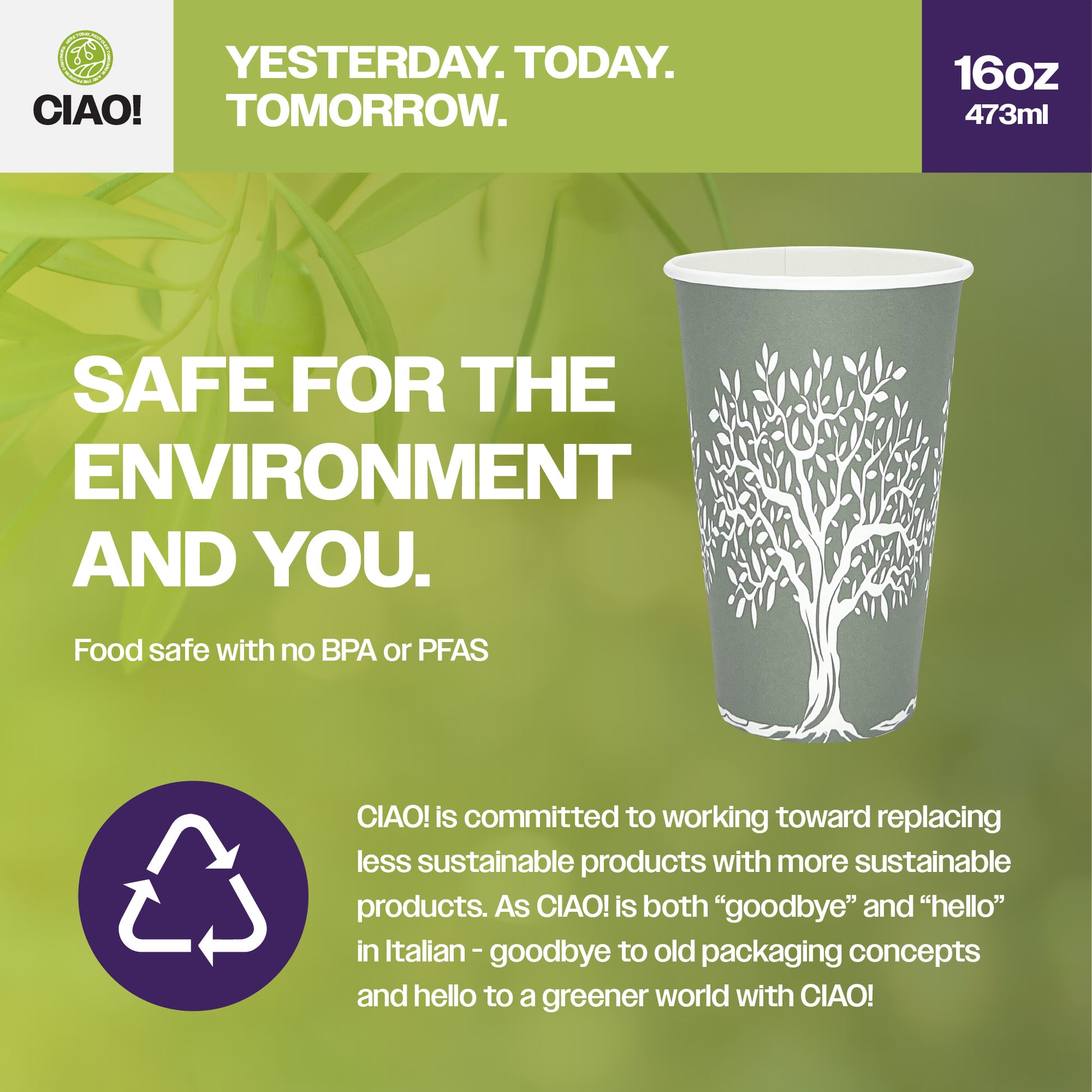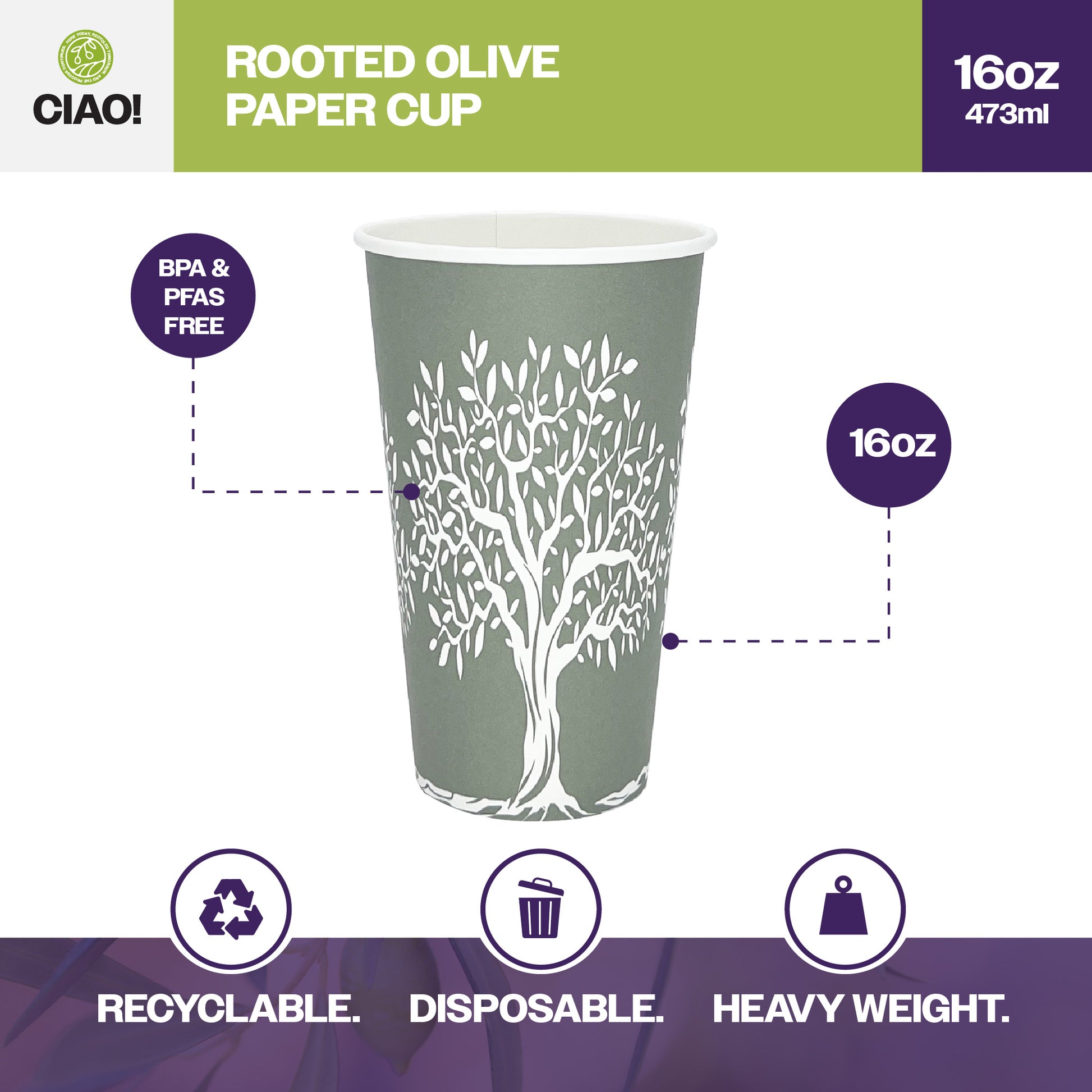CIAO! 16 oz Hot Paper Cups – Rooted Olive Print (Case of 1,000)